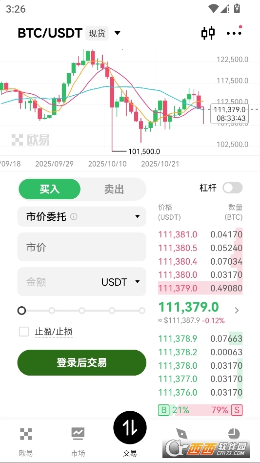 进行币币交易:点击底部“交易”按钮,进入“币币”交易区。您可以将之前购买的USDT(泰达币,一种与美元挂钩的稳定币)作为基础资金,选择您看好的交易对(如BTC/USDT),输入买入价格和数量,即可下单。与全球用户一起,在市场的波动中寻找机会。