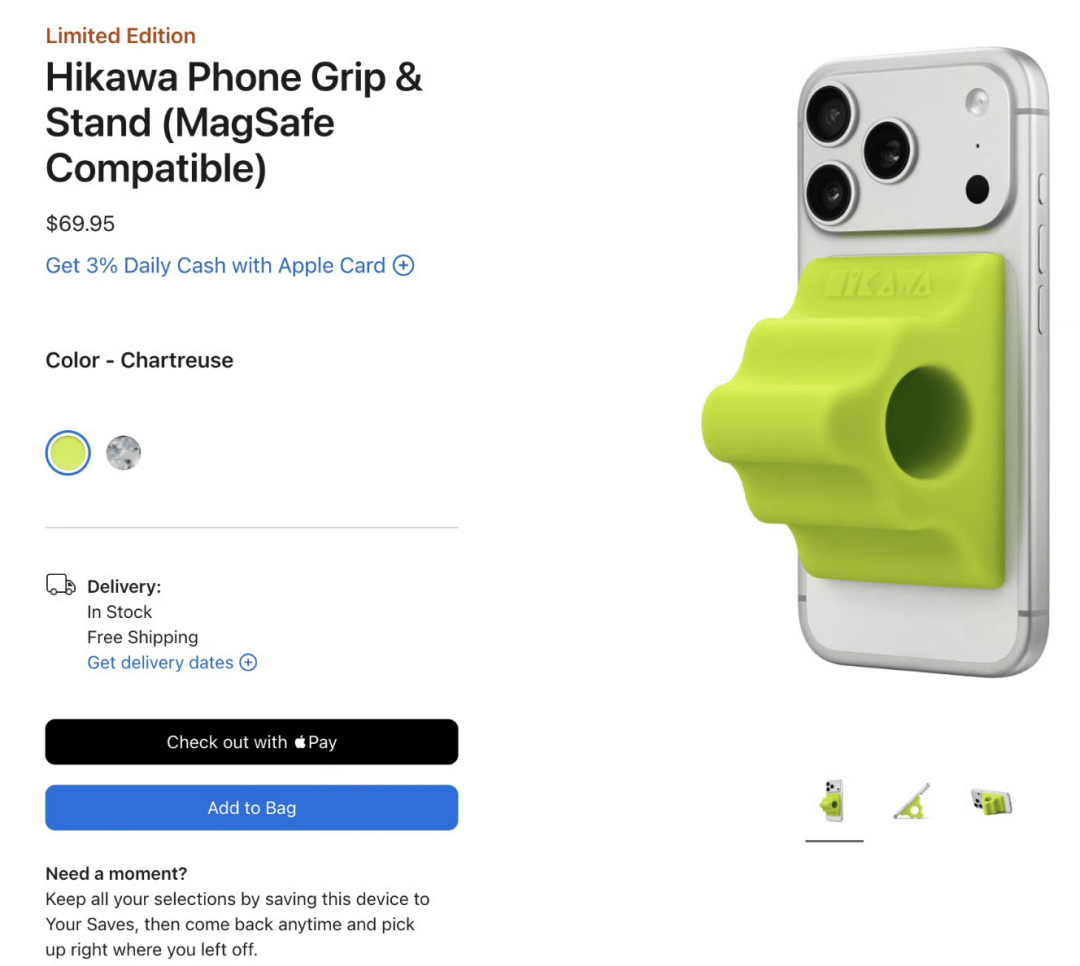 该配件由洛杉矶设计师Bailey Hikawa联合设计,采用高端硅胶材质,专为兼容MagSafe的iPhone机型打造,可减少用户保持手机稳定所需的力量,旨在帮助残障用户更轻松地稳固持握设备。